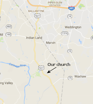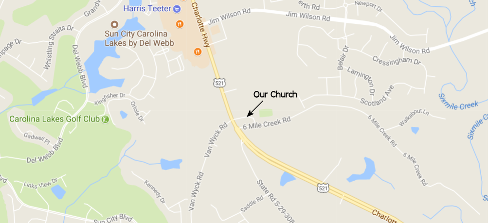 Our worship services and our Church Offices are located at the intersection of US 521 and Van Wyck Road about a 10 miles south of I485. Maps showing our location are below.